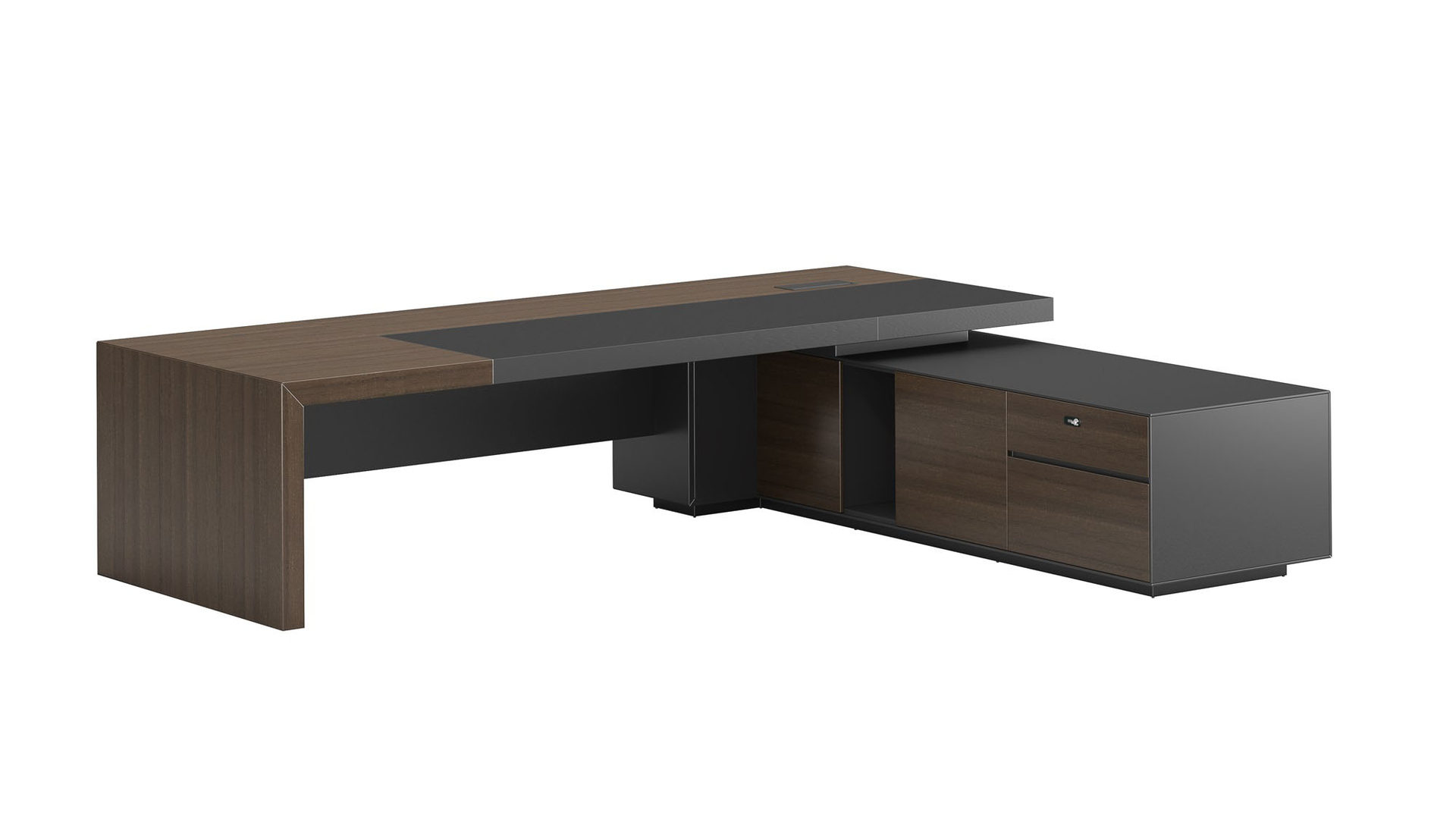 明哲系列办公家具,采用直纹胡桃和星空灰实色漆元素,高档实木质感饰面,深邃饱满,纹理清晰,内蕴深厚。搭配简约端正的造型设计,台脚的斜切装置,还有产品的布局变化,错落有致,承前启后,展现极致简洁和视觉效果的完美诠释。低调又不失时尚,稳重又不失灵动,既营造现代时尚的情绪,还给当今办公环境注入明亮、轻松的舒适感。
